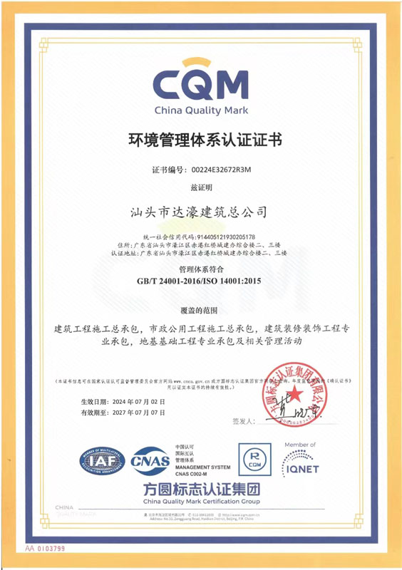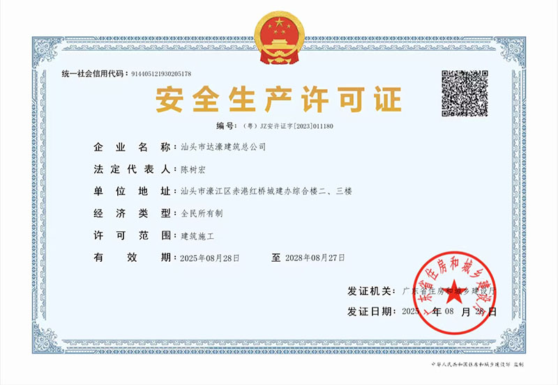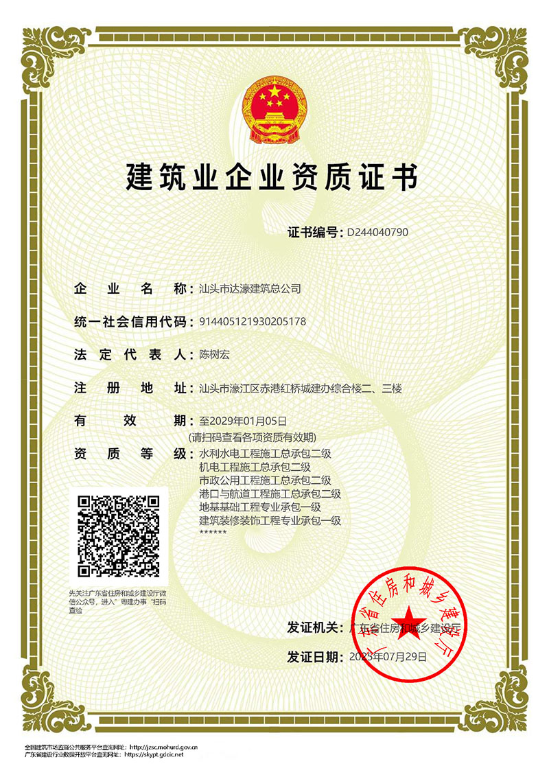 汕頭市達濠建筑(集團)有限公司(以下簡稱“公司”)成立于1990年。2026年2月24日經汕頭市濠江區(qū)市場監(jiān)督管理局核準,由原汕頭市達濠建筑總公司變更登記為汕頭市達濠建筑(集團)有限公司。公司現(xiàn)注冊資金肆億玖仟壹佰萬元,是具有建筑工程施工總承包壹級、建筑裝修裝飾工程專業(yè)承包壹級、地基基礎工程專業(yè)承包壹級、市政公用工程施工總承包貳級、港口與航道工程施工總承包貳級、機電工程施工總承包貳級、水利水電工程施工總承包貳級、鋼結構工程專業(yè)承包貳級、建筑機電安裝工程專業(yè)承包貳級、房地產開發(fā)貳級資質的國有獨資企業(yè)。